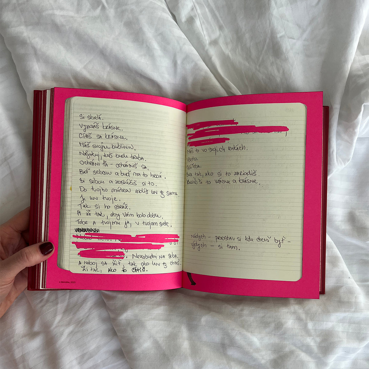texty sú obohatené mojimi škrabopisne napísanými denníkmi, fotkami z detstva, fotkami z mobilu a fotkami od úžasného jakuba gulyása, ktoré sme počas tých piatich rokov spolu fotili, väčšinou u neho doma v obývačke.